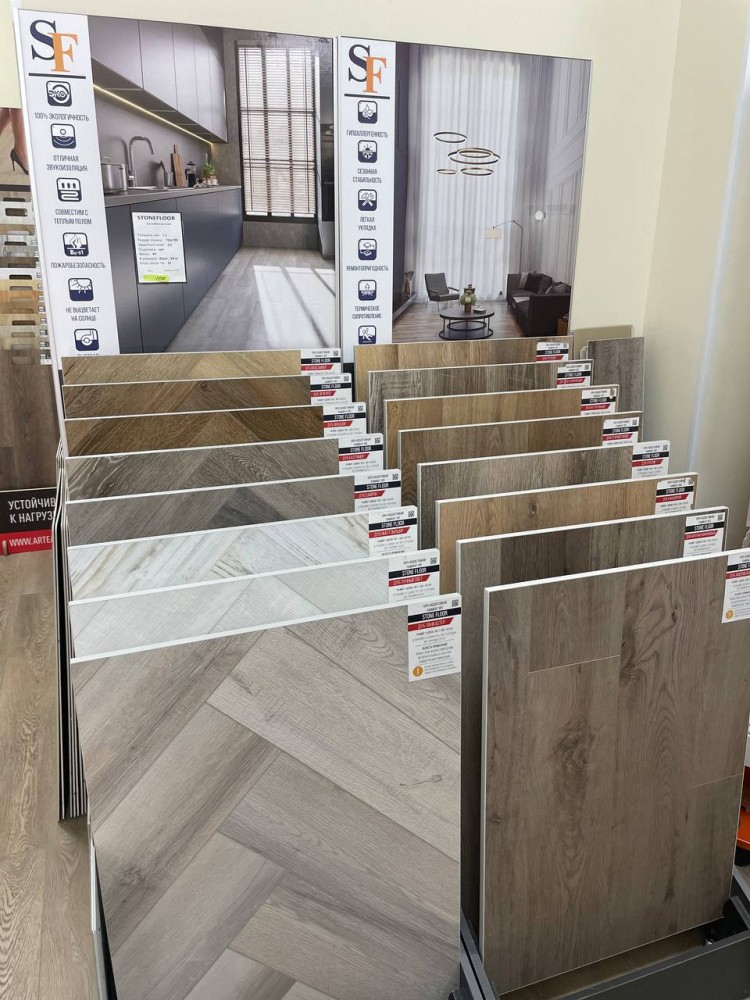 Наша сеть предлагает широкий ассортимент напольных покрытий – ПВХ плитка, Каменный SPC ламинат, кварц виниловые полы, инженерная доска и паркет.